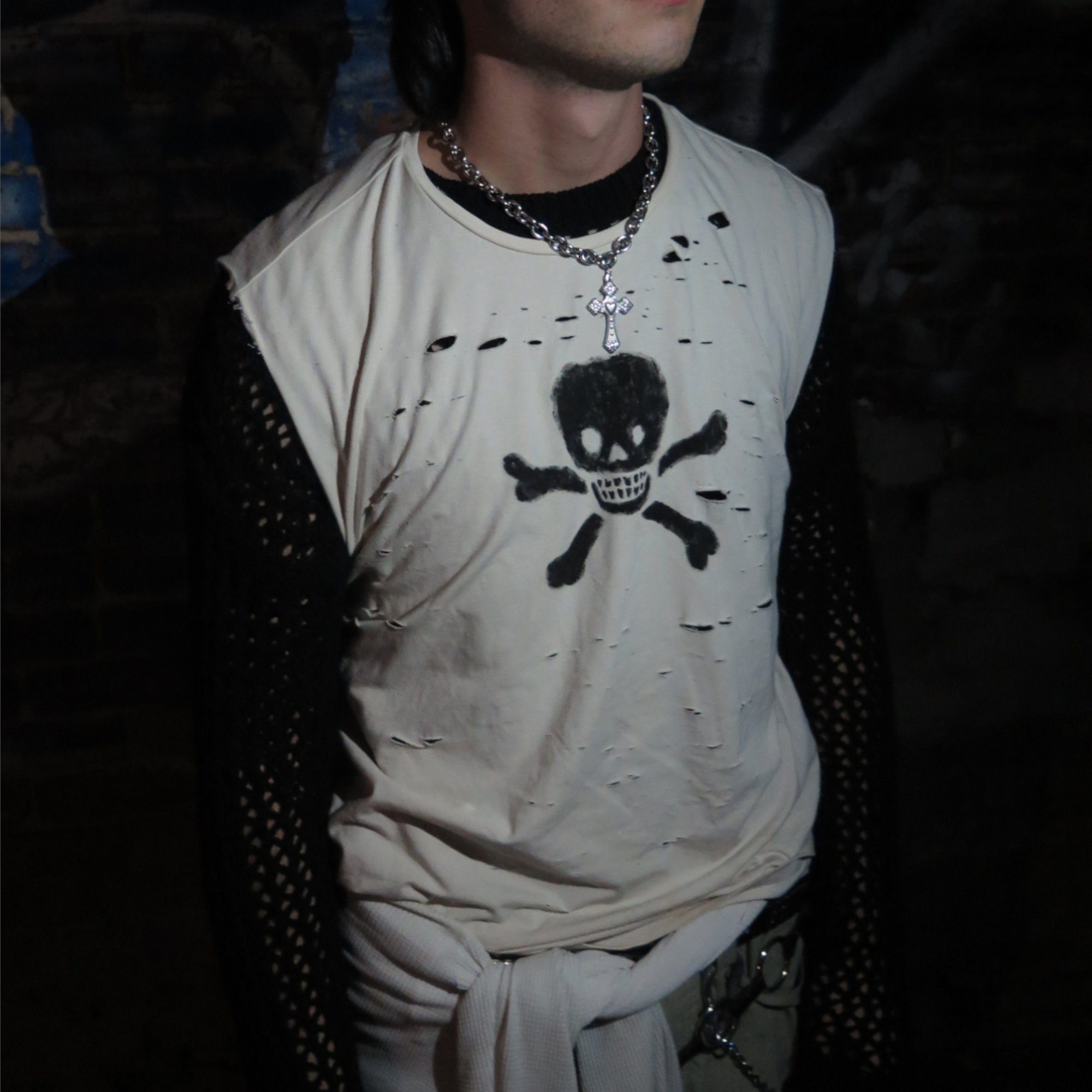 Crafted from upcycled tees, each uniquely distressed piece boasts a fierce handpainted skull and bones graphic on the chest.